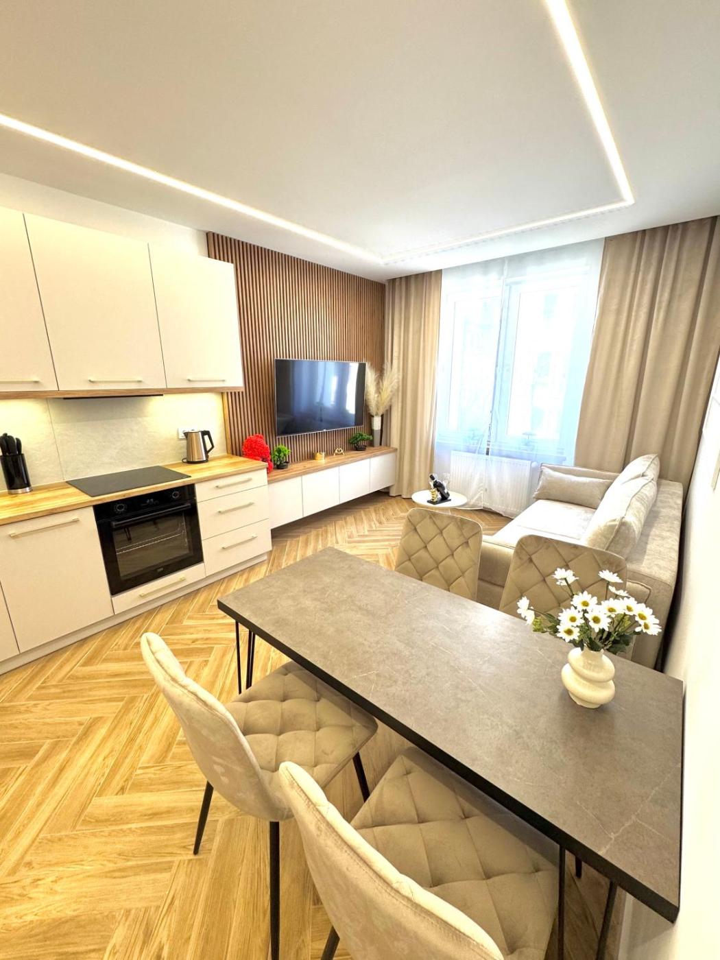 Apartament z 1 sypialnią. Guests can make meals in the kitchen that features a stovetop, a refrigerator, a dishwasher and kitchenware. This apartment has a washing machine, flat-screen TV with streaming services, garden views, as well as winechampagne for guests. The unit has 2 beds. Apartament - 4 osobowy. Powierzchnia pokoju ok.: 32 mkw.